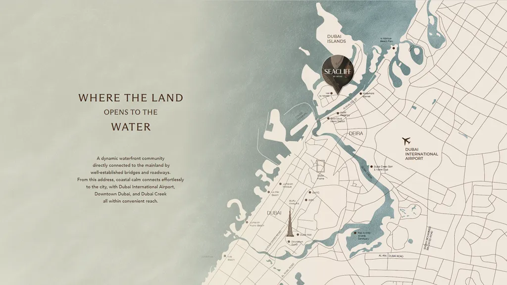 Sea Cliff by Imtiaz is located on Dubai Islands, one of Dubai’s most promising waterfront destinations. The project enjoys a setting shaped by open water, wide views, and a relaxed island atmosphere. At the same time, it stays connected to key areas of the city through established bridges and major roads. The brochure highlights convenient access to Dubai International Airport, Downtown Dubai, and Dubai Creek, which adds to the project’s appeal for residents and investors alike.